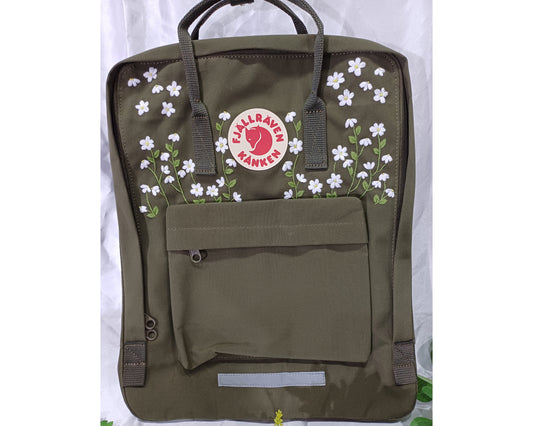 Fjallraven Kanken Backpack with White Daisy Embroidery - Personalized Embroidered Backpack - Custom Bag for Women