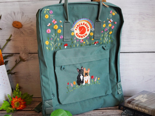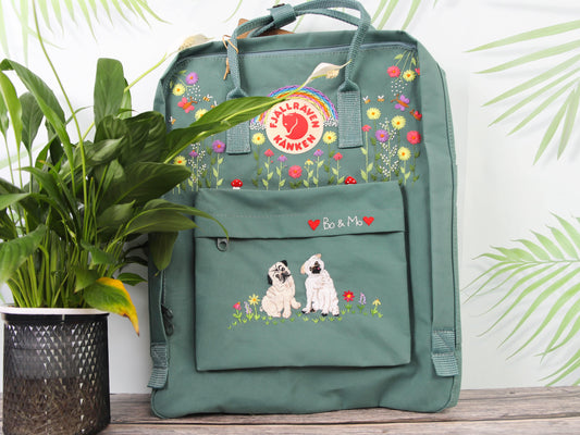 Fjallraven Kanken Backpack with Embroidered Dogs and Flowers - Personalized Embroidered Backpack - Custom Bag for Women