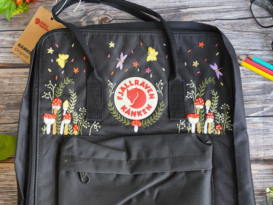 Fjallraven Kanken Backpack with Embroidered Mushrooms and Butterflies - Personalized Embroidered Backpack - Custom Bag for Women