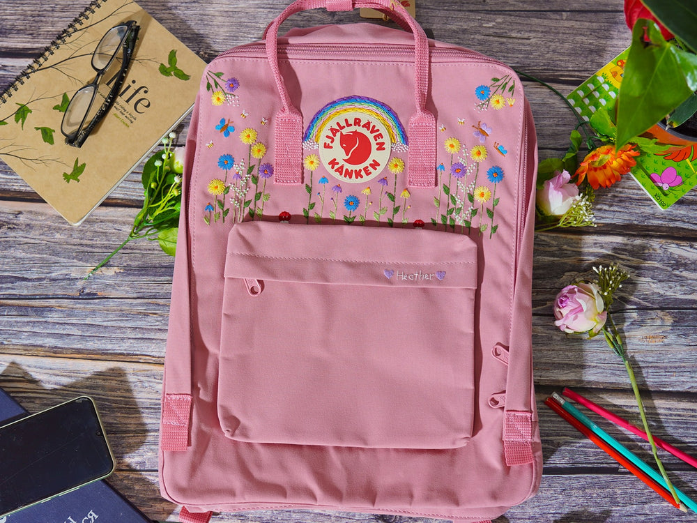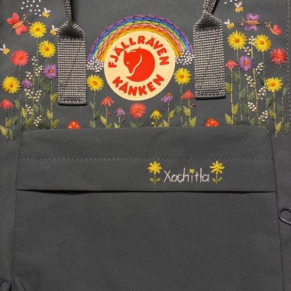 Fjallraven Kanken Backpack with Embroidered Forest Flowers and Rainbow - Personalized Embroidered Backpack - Custom Bag for Women